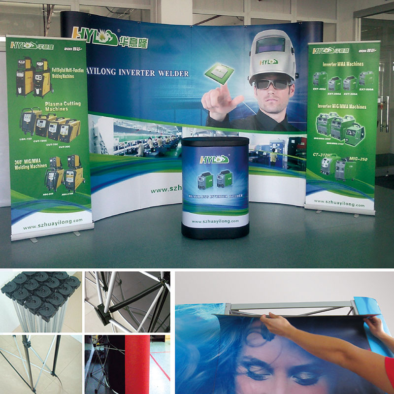 旗、刀旗、易拉寶、拉網展架、彩易展系統(tǒng)、快幕秀、促銷臺、L形展架、人像立牌、海報架等。